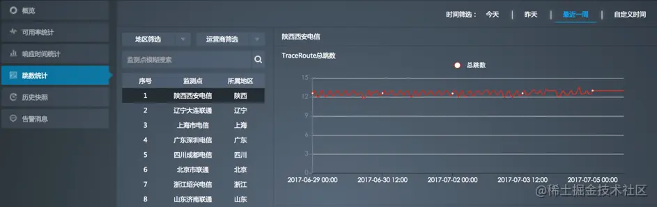 您可以通过地区和运营商来筛选监测点,同时可通过模糊搜索来查找监测点。单击监测点能够查看具体每个监测点的历史快照列表。