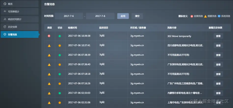 - 在时间筛选栏中可以自定义时间范围,查看指定范围内的告警消息。