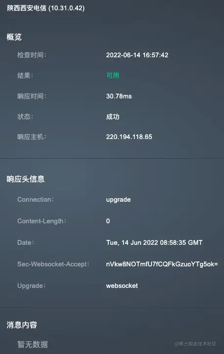 概览:包括检查时间、检查结果、响应时间、WebSocket探测状态、响应主机、响应头信息。
