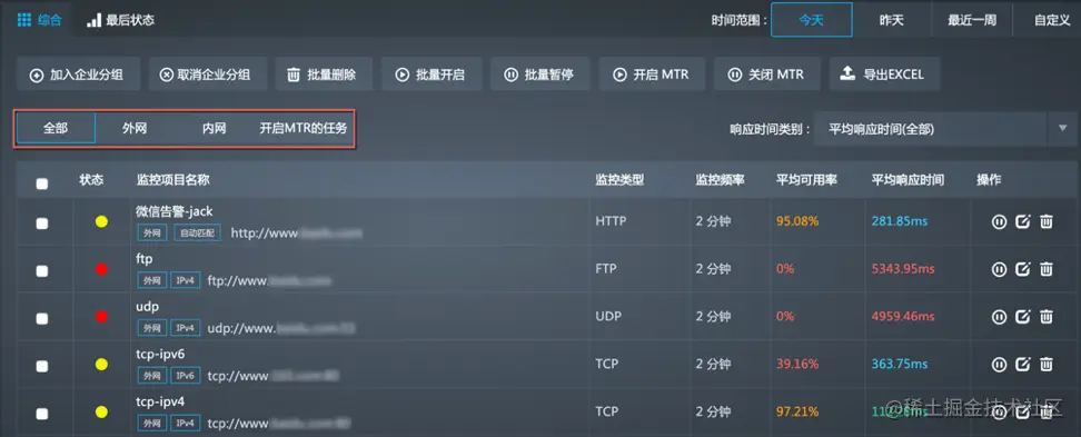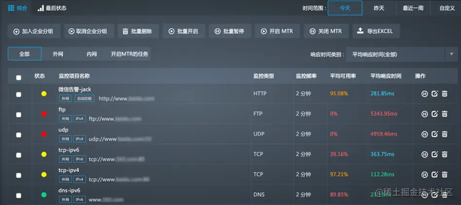 在综合列表中,您可以按照时间查看监控任务在不同时间段内的平均可用率和平均响应时间。