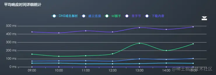 - 在平均响应时间详细统计图中查看DNS域名解析、建立连接、首字节和下载内容的时间变化趋势。