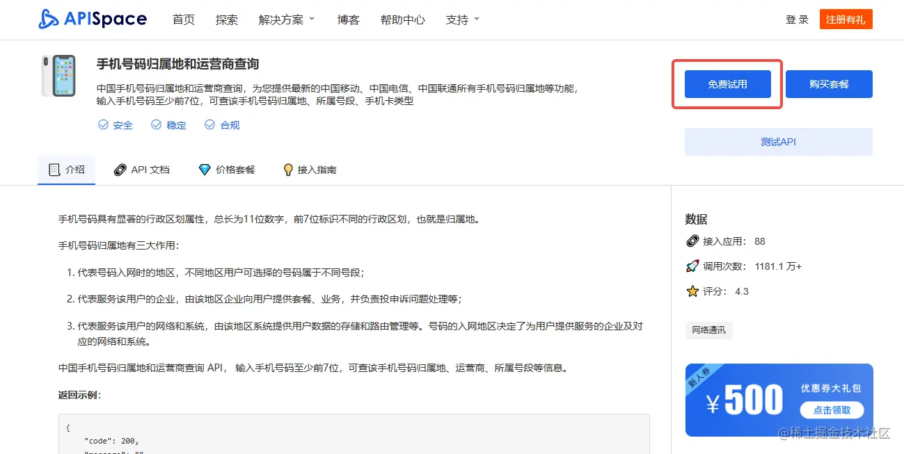 1.注册登录 APISpace,进入手机号码归属地和运营商查询详情页,点击【免费试用】按钮即可领取免费次数