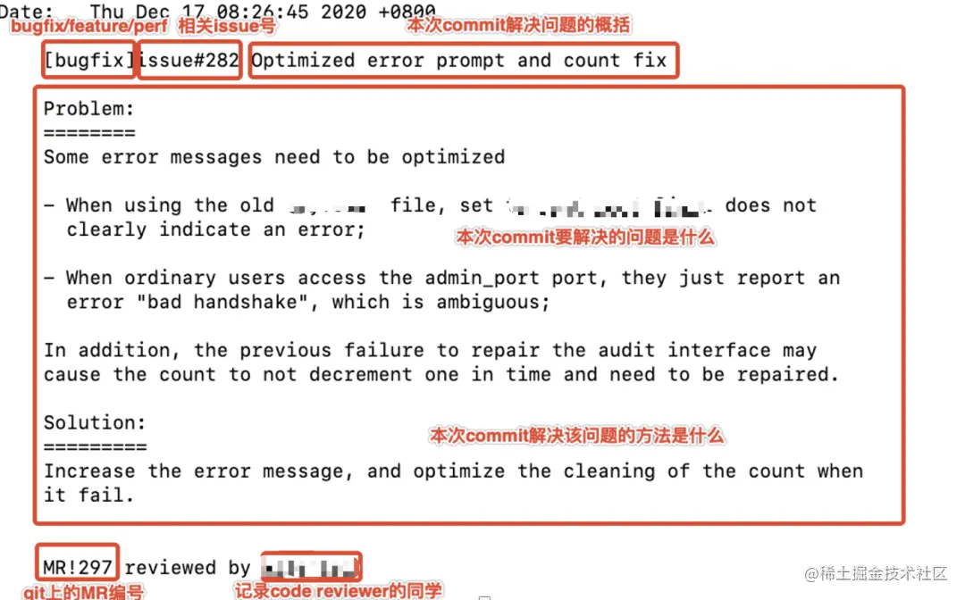 写好commit log很重要,它可以帮助我们快速了解这段代码的很多信息。为了从commit log中获取足够多的信息,我们对commit log有严格要求,每一个commit需要包括完整的信息: