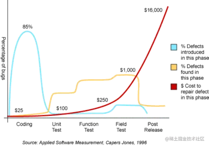 上图是出自applied software measurement这本书,图中有三条曲线。横坐标代表软件开发的5个阶段:编码,单测,功能测试,线上环境模拟测试,线上发布。纵坐标表示缺陷百分比。绿线表示缺陷产生在各阶段的分布,黄线表示各阶段发现缺陷的数量分布,红线表示修复缺陷在不同阶段需要的成本。我们可以从图中得到以下结论:大多数缺陷是在编码过程中产生,在测试中被发现和修复,随着功能的测试上线,修复缺陷的成本也成指数级增长。因此code review作为测试后上线前的阶段,发现缺陷和解决缺陷也变得尤为关键,有效避免缺陷留到线上造成巨大损失。