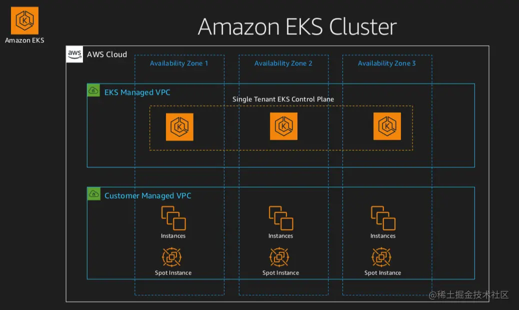 在这里可以看到 EKS Control Plane,也就是 k8s 的 Master ,是托管在EKS管理的VPC里面的。注意到这里写 Single Tenant,也就是单租户,即每个集群有自己的独立的资源,而不与其他的集群共享。这个 Control Plane 是部署在三个可用区的,确保跨可用区的高可用。在下面是 Data Plane,也就是 k8s 的 Node . 这块是部署在客户自己的VPC里面,可以选择EC2,也可以选择 Fargate。