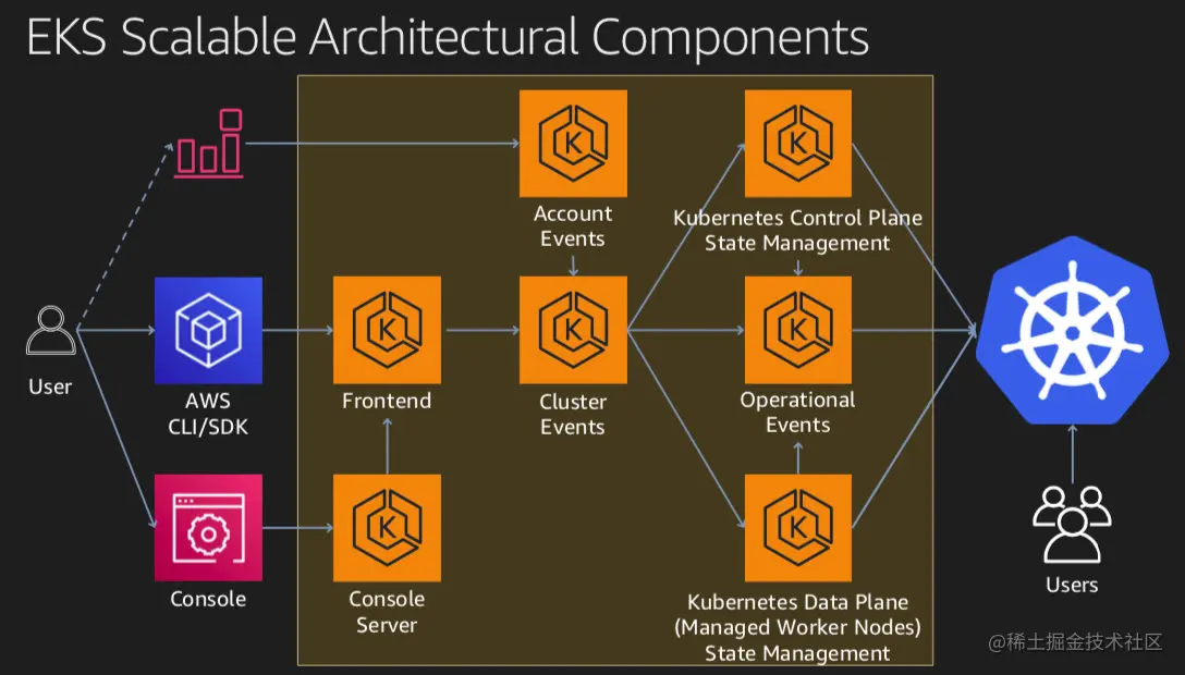 中间这一坨黄色框框里的就是EKS背后的组件了。看起来是一个典型的微服务架构:首先从最左边的 Frontend 开始,这里提供了EKS API,用户可以通过 AWS CLI/SDK 来发起相应的API操作,比如查询或创建集群等。Console,也就是UI,是有一个单独的 Console Server,然后调用 Frontend. 所以说 AWS 的服务都是先有API,然后才有UI 。各种的事件汇聚后,会由两个状态管理服务来分别对集群的Control Plane和Data Plane(如果使用托管节点组)进行管理。