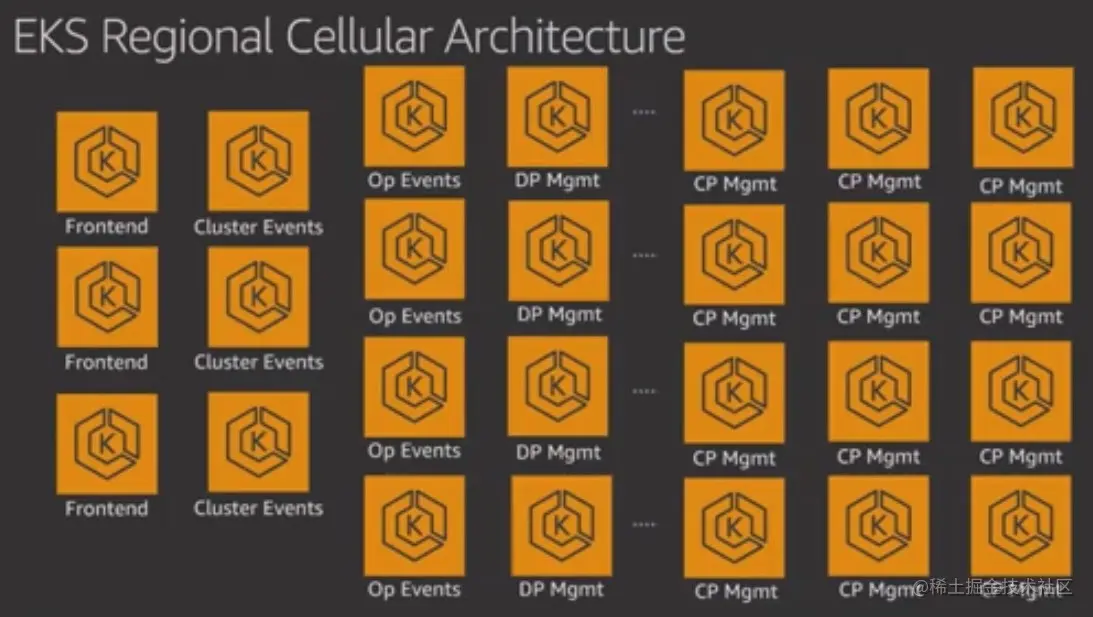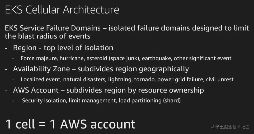 这里开始介绍 EKS 这个托管服务自身的设计架构。整体来说这是个 Cellular Architecture ( 蜂窝架构),先划分出 Failure Domain(失效域):最高一级的隔离级别是 Region(区域) ,然后是Avalability Zone(可用区)。看到这里有点意外的是 AWS Account 是在区域下面划分出来的,每个AWS Account 就是一个最基本的Cell(单元),运行一个区域内的一个软件组件的一个实例,不过想想也是,一个AWS Account就是安全的隔离边界,对某个软件组件的变更只会限制在某个区域,而不会出现同时对多个区域进行变更的情况。可以脑补下一个AWS Region下,有N多个这样的 Cell 运行着 EKS 这个服务背后不同的软件组件。正如前面提到的,就像一个蜂窝一样。这个架构思路不是EKS特有的,其他AWS的服务也是按照这个思路进行设计。