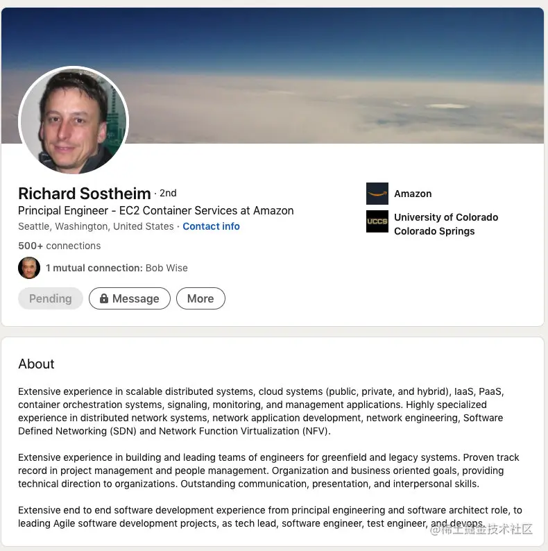 听了一下这个演讲小哥的介绍,是EKS团队的Principle Engineer,从EKS这个服务一开始就在了。照例先到Linkedin上八卦一下:
