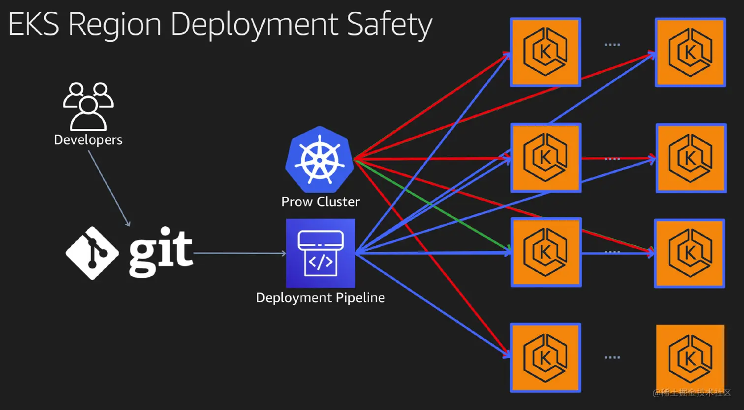 如果EKS这个服务有升级,如何安全地进行部署呢?这里以 Control Plane Management 这个组件为例,EKS的研发工程师会往 Git 仓库上提交代码,在 code review 后触发 Deployment Pipeline 进行测试和部署,这部分的工作就完全是自动化的而无须人工干预了。 在PPT上面没有显示出来,在实际的环境中是有Beta, Gamma等独立的环境。EKS团队使用了开源的 Prow 来进行一系列的端到端的测试,还有一个独立的系统来进行集成测试和金丝雀测试等。在相关的测试完全通过后才会进行实际的部署。