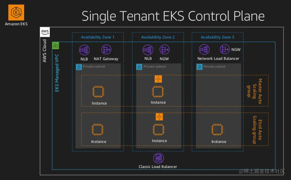 Control Plane 里相关的几个组件,比如 API Server, Controller Manager 和 Scheduler 等会部署在一个Auto Scaling Group中(2个EC2实例),另外 etcd 会部署在另一个单独的ASG中(3个EC2实例),这两个ASG都是在EKS托管的VPC中,实例的水平伸缩和垂直伸缩都是由EKS来自动管理。 Control Plane的实例都部署在私有子网,API Server对外是通过NLB来提供访问。