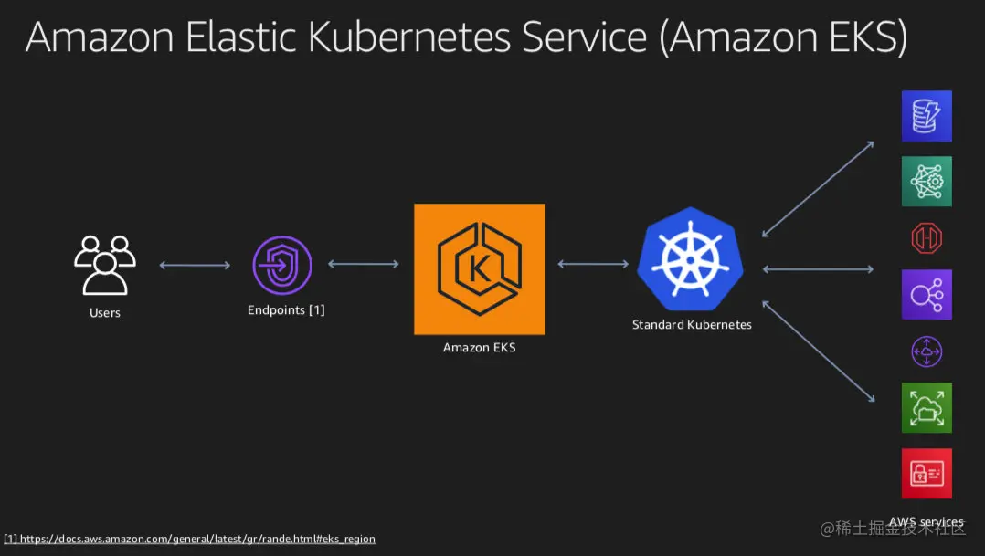 EKS是一个区域服务(中间那个黄色的图标),客户通过 EKS Endpoint 来与 EKS 服务进行交互。 EKS 会帮客户创建 K8s 集群,这个k8s是与上流社区 100% 代码兼容的,客户可以在这个 K8s 集群上运行自己的应用,这个K8s集群也可以与AWS的其他服务无缝地集成,比如说身份认证,负载均衡等