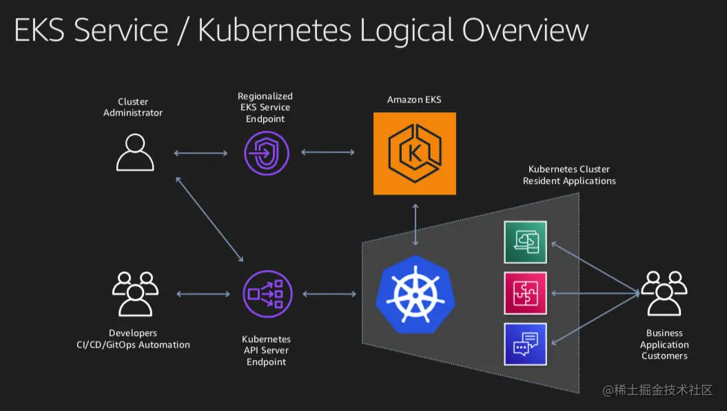 K8s集群相关的有几个使用者,第一是集群的管理员,或是Infra团队,会通过刚才提到的 EKS Endpoint 来进行 K8s集群的管理(部分的操作也会通过k8s的 API Server Endpoint来进行);第二是开发团队,或是CICD的自动化工具,会通过 K8s 的 API Server Endpoint 来进行应用的部署;最后一个是应用的最终使用者,直接通过k8s对外暴露的服务接口来访问应用(他们也不需要知道应用是不是部署在K8s上面)