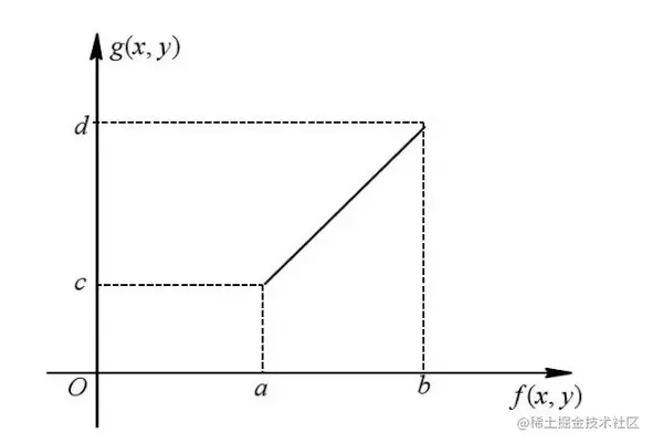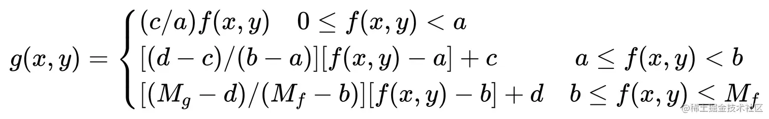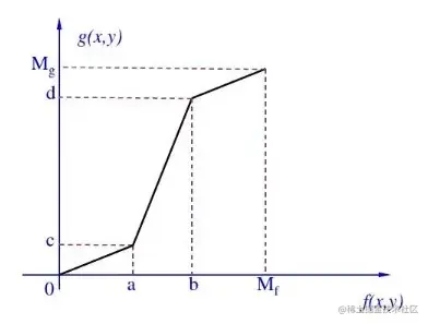 为了突出感兴趣的目标或灰度区间,相对抑制那些不感兴趣的 灰度区间,可采用分段线性变换。常用的是三段线性变换,如图。对应的数学表达式为: