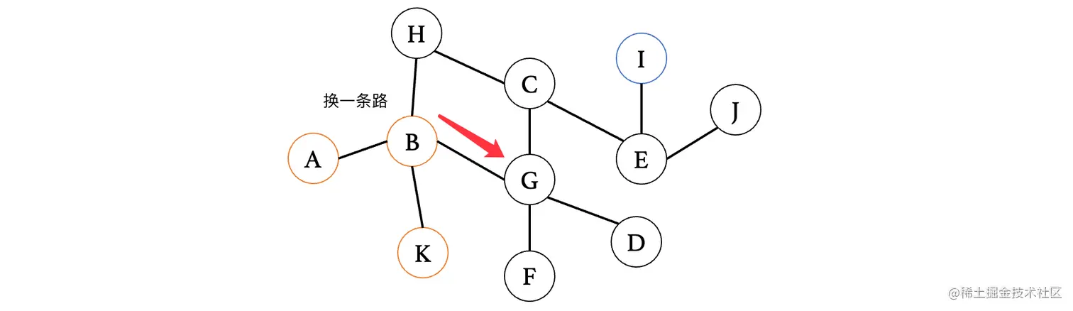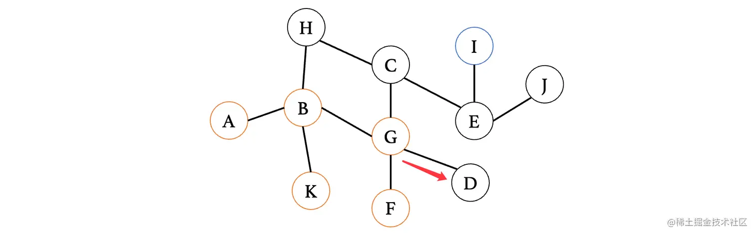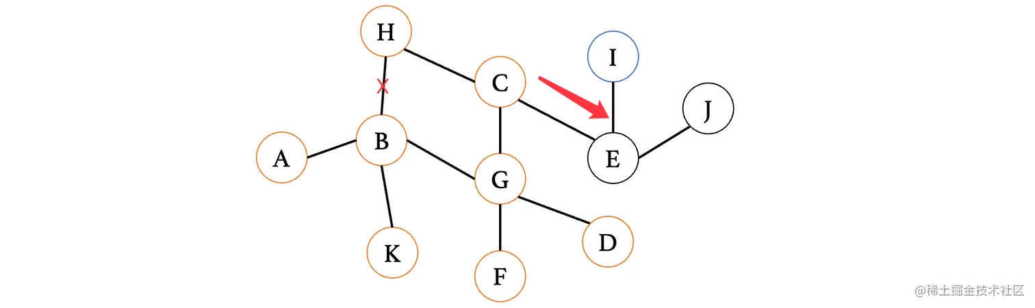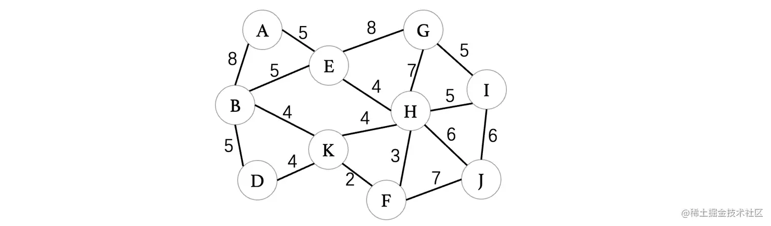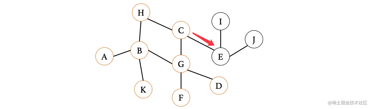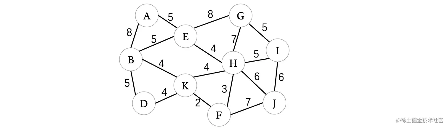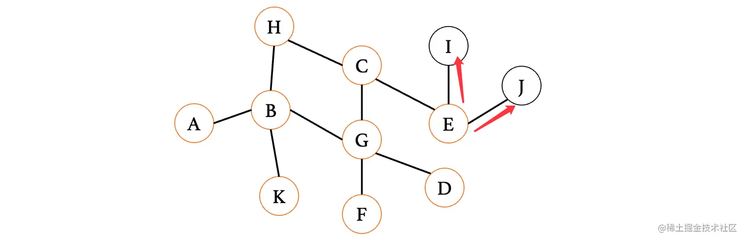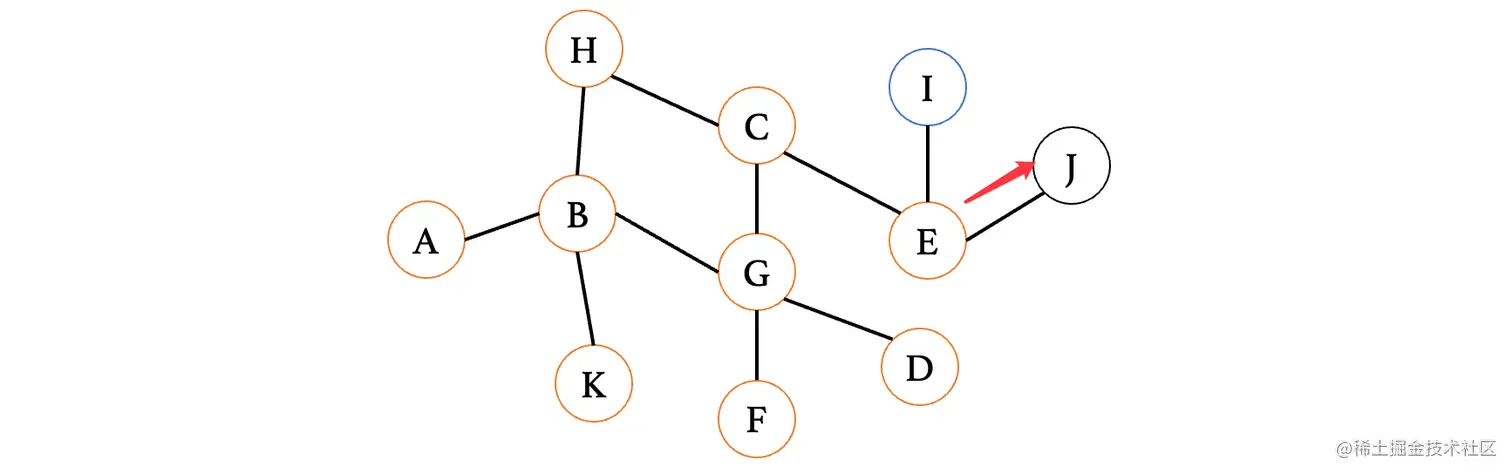 然后我们来看下一个距离A最近的顶点E,E连接的就比较多了,此时E最短路径是从D过来的,那么我们就不考虑D,我们来依次看看与其相连的C、F、G、H、J(注意这里比较的是从E到这些顶点,之前比较的是从这些顶点到E,不要以为是一样的了)