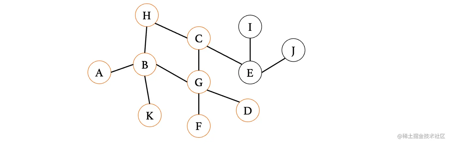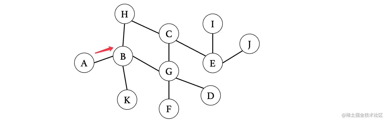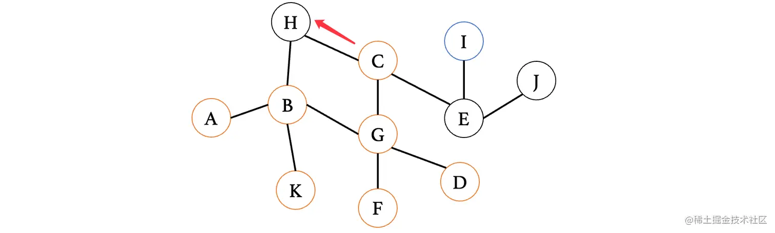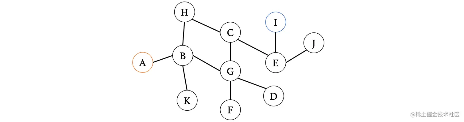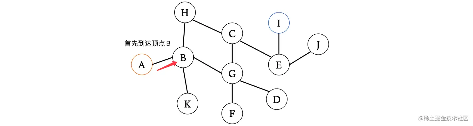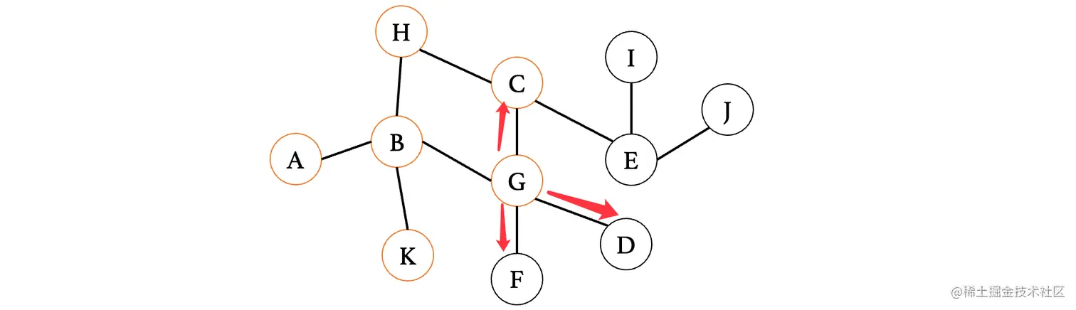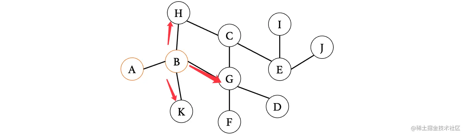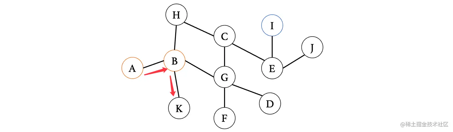 然后我们来看下一个距离A最近的顶点E,E连接的就比较多了,此时E最短路径是从D过来的,那么我们就不考虑D,我们来依次看看与其相连的C、F、G、H、J(注意这里比较的是从E到这些顶点,之前比较的是从这些顶点到E,不要以为是一样的了)