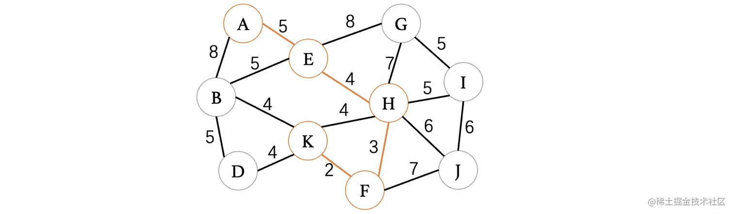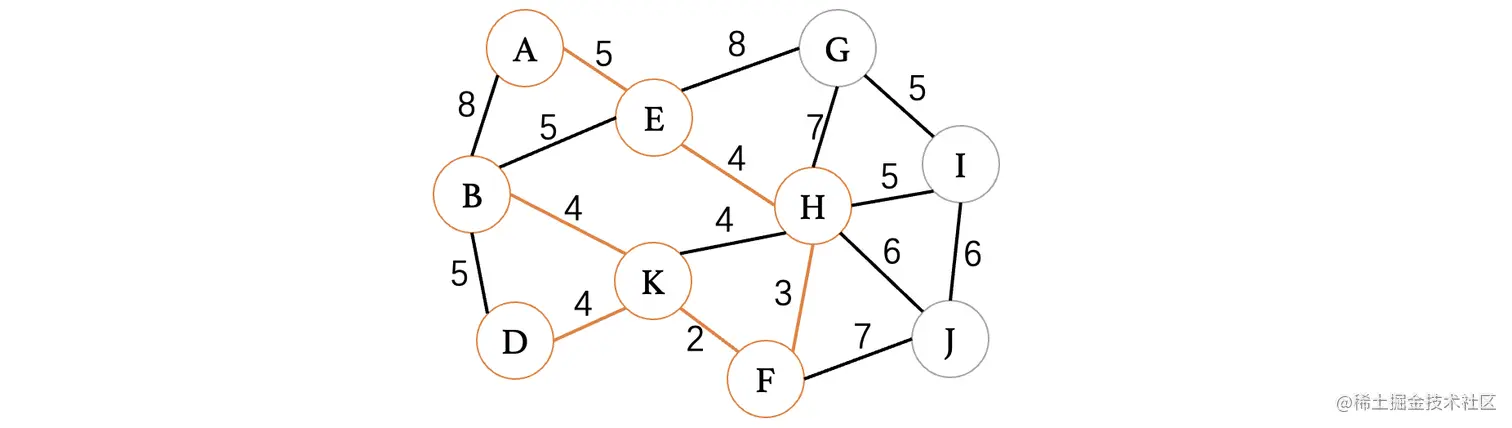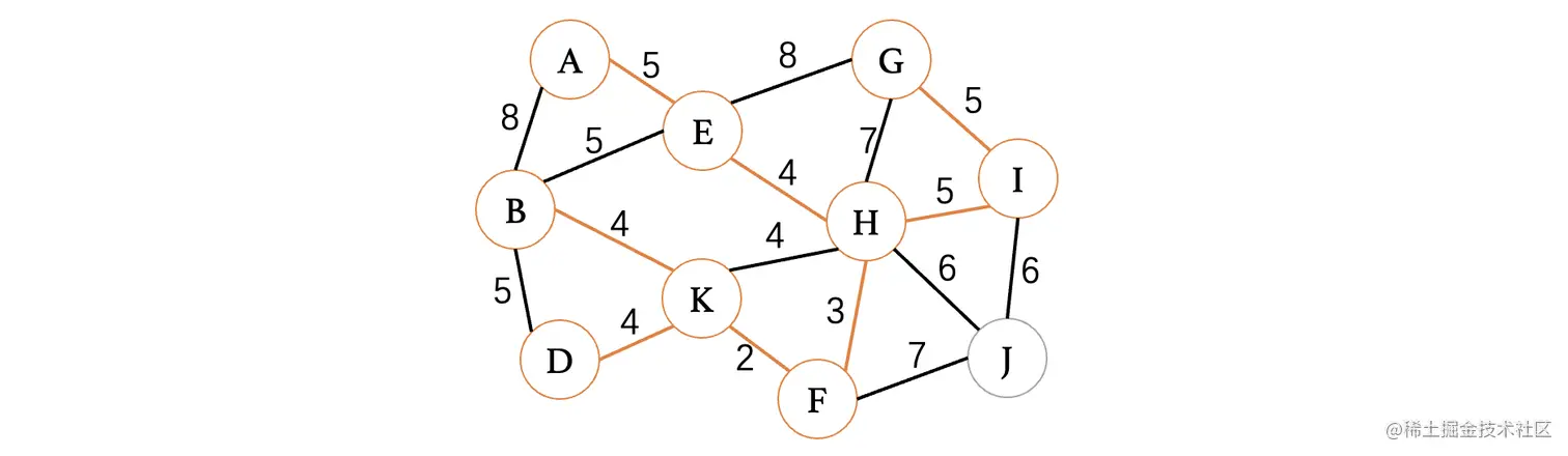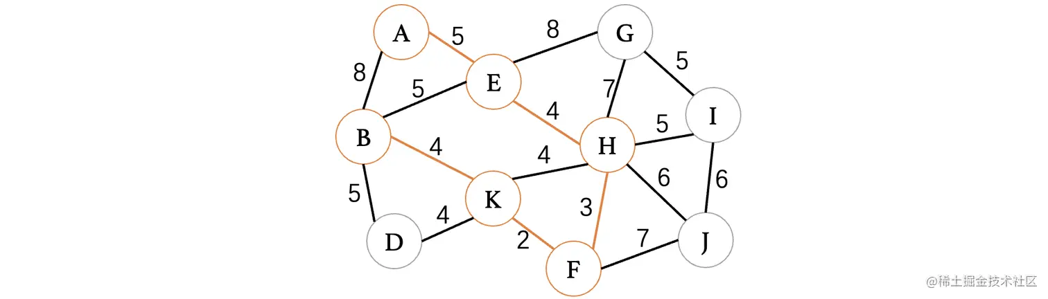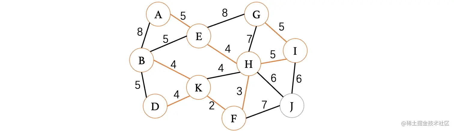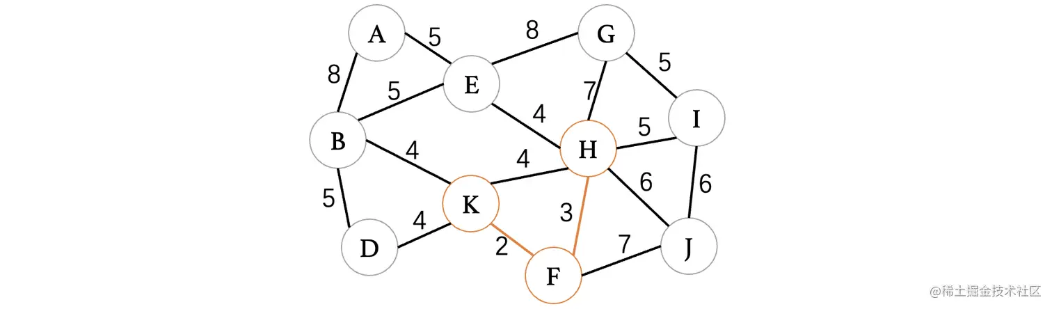 此时最小的权重就只有4了,目前有4条边都可以进行选择,但是K、H这条边因为K和H都已经在树中了,所以说不能考虑,其他三条边都是没问题的,我们随便选择一条就行了: