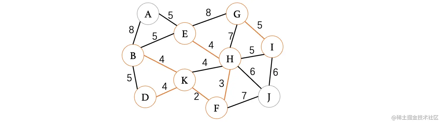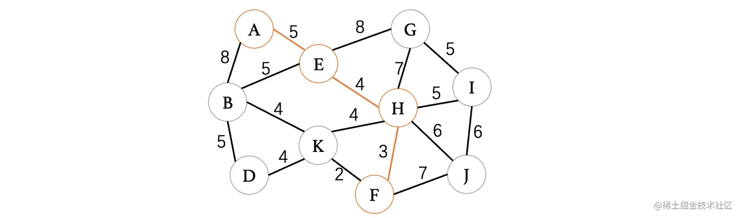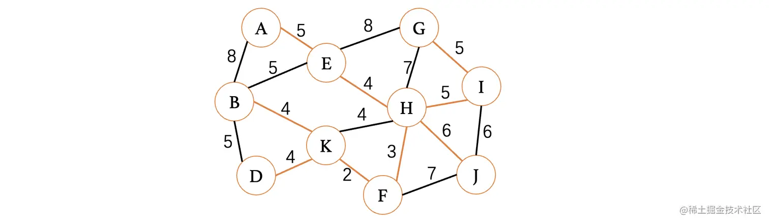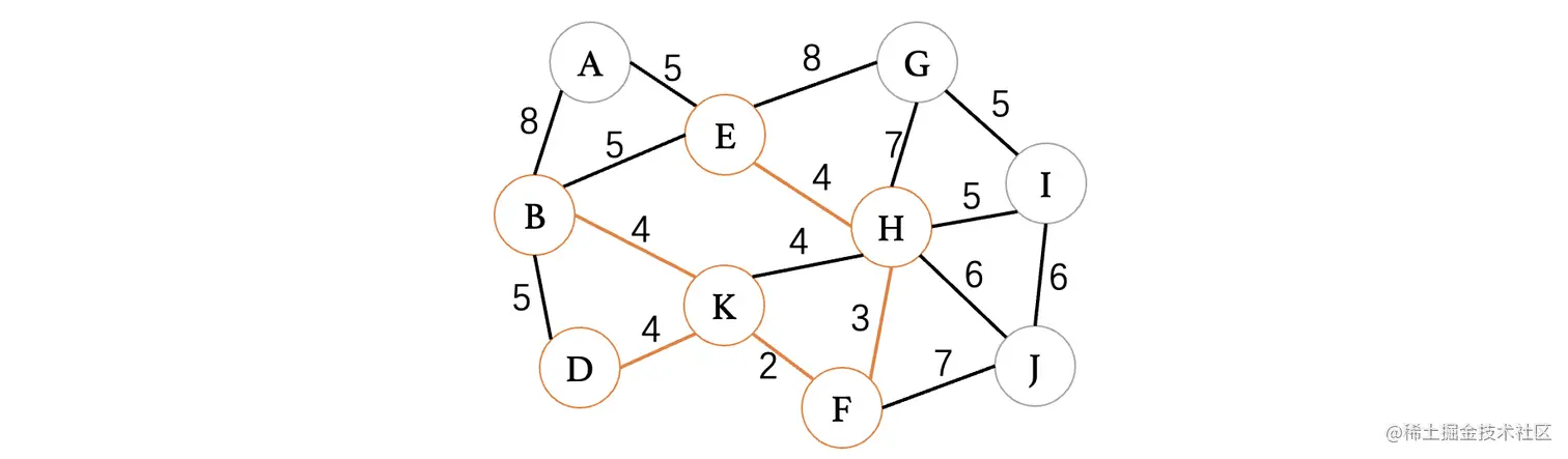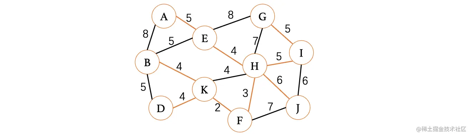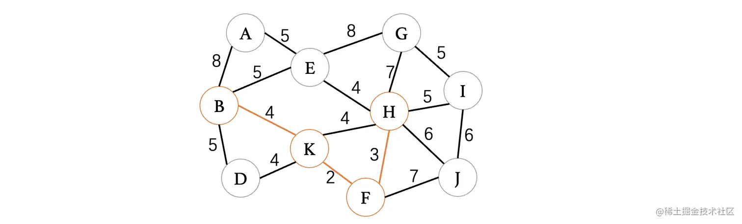 此时最小的权重就只有4了,目前有4条边都可以进行选择,但是K、H这条边因为K和H都已经在树中了,所以说不能考虑,其他三条边都是没问题的,我们随便选择一条就行了: