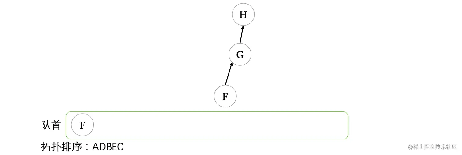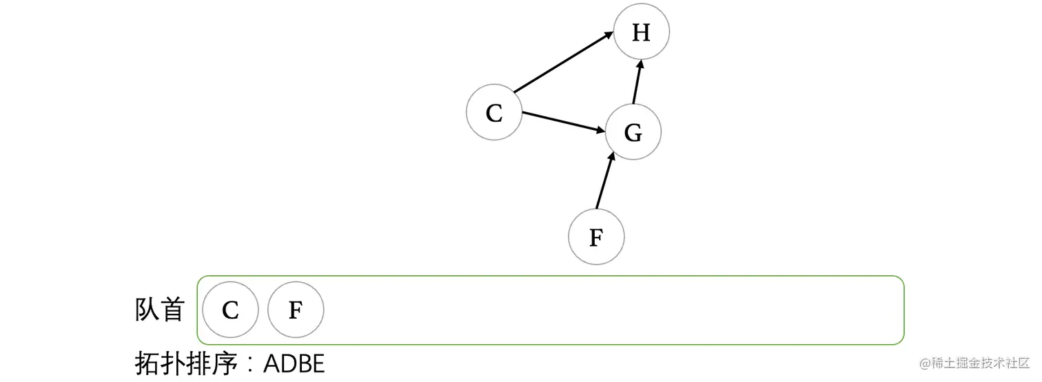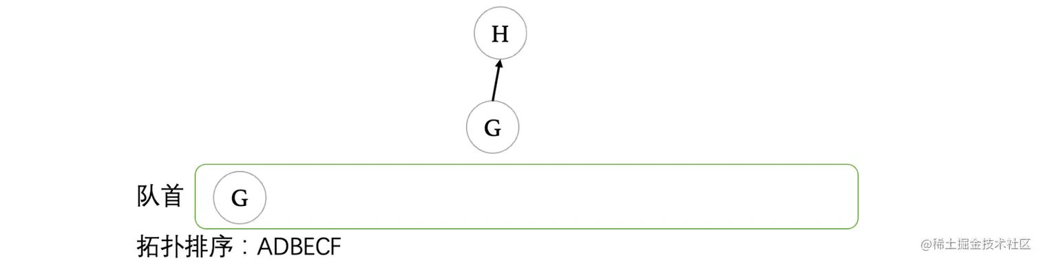 当F出队后,顶点G变成了入度为0的顶点,此时将G入队: