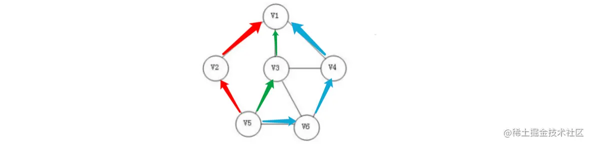 图通过边将顶点相连,这样我们就可以从一个顶点经过某条路径到达其他顶点了,比如我们现在想要从下面的V5点到达V1点: