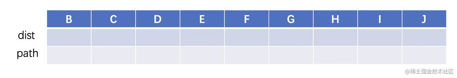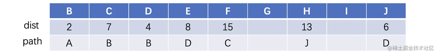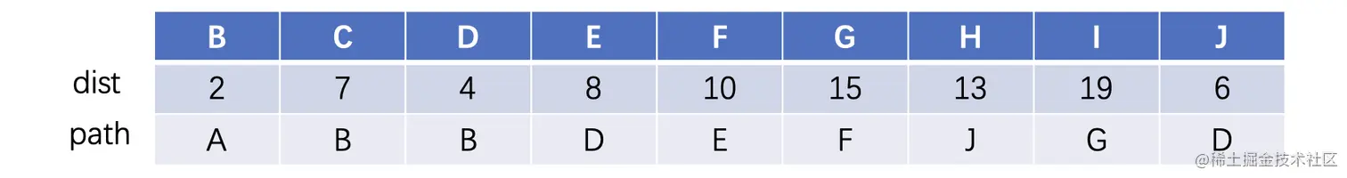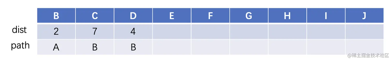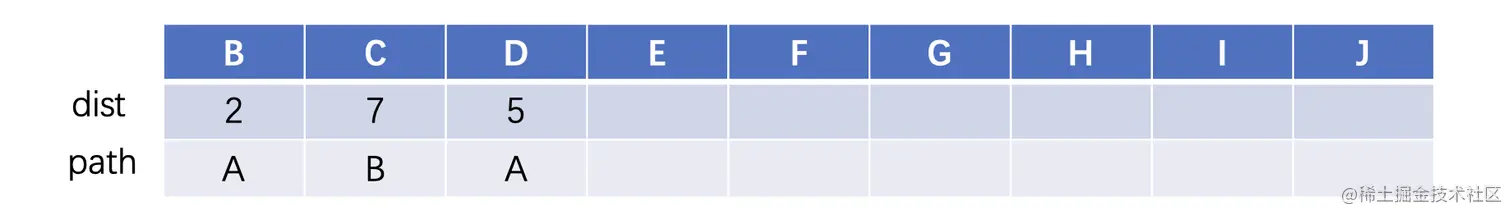 dist这一行记录A到其他顶点的最短路径,path这一行记录的是最短路径所邻接的顶点,我们首先还是从A开始,与A直接相邻的两个分别是B和D,其中B的距离是2,D的距离是5,那么我们就先进行一下记录: