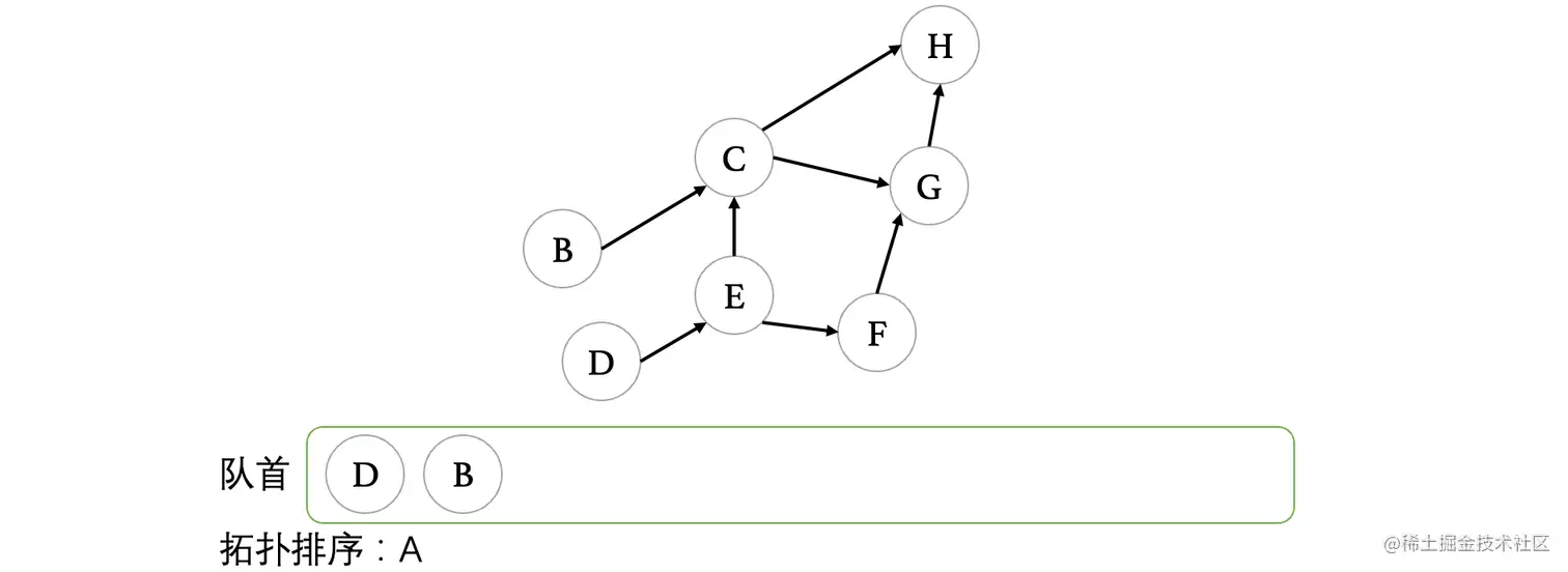 当目前所有度数为0的顶点进入队列之后,我们开始出队,正式开始拓扑排序,当此顶点离开图之后,图中会不会有其他顶点的入度变为0,如果有,将其他顶点入队。比如此时A出队之后,那么A要从图中移除,现在B也变成了入度为0的顶点,所以说将B丢进队列: