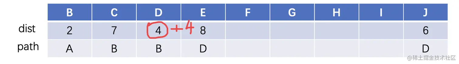 然后我们来看顶点D,此时我们发现,除了A直接到D之外,从B也可以到达D,那么我们就可以比较一下,看是从B到D更短一些,还是从A直接到D更短一些 ,通过比较,我们发现从B绕过去会更短一些,只需要4即可,所以说我们将其更新一下: