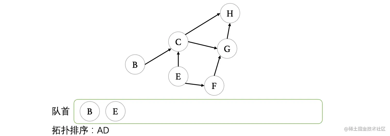 接着我们继续出队,B出队之后,我们发现没有任何顶点入度变为0了,继续: