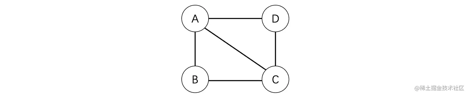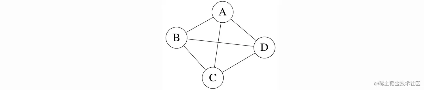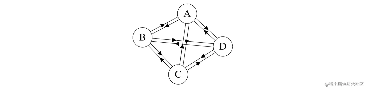 邻接矩阵实际上就是用矩阵去表示图中各顶点之间的邻接关系和权值。假设有一个图,其中有N个顶点,就可以使用一个N×N的矩阵来表示,比如下面有A、B、C、D四个顶点的图: