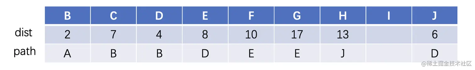 此时继续找到表中下一个距离A最近的顶点J,J可以到达H或者是E,按照同样的方式,我们看看是从D直接到E更短,还是从J到E更短,进行比较,得到结果是D直接过去更短,所以说不需要更新。然后H更新为J过去的最短路径: