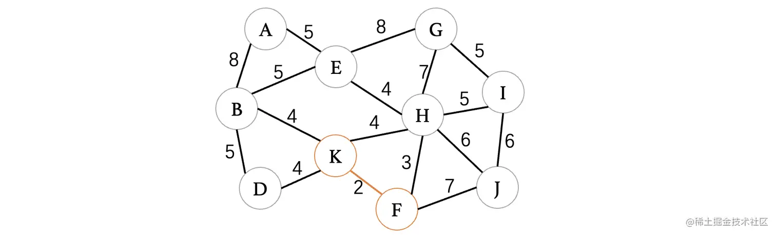 首先我们直接找到最小边,K、F,它的权值为2,所以说直接选择就行: