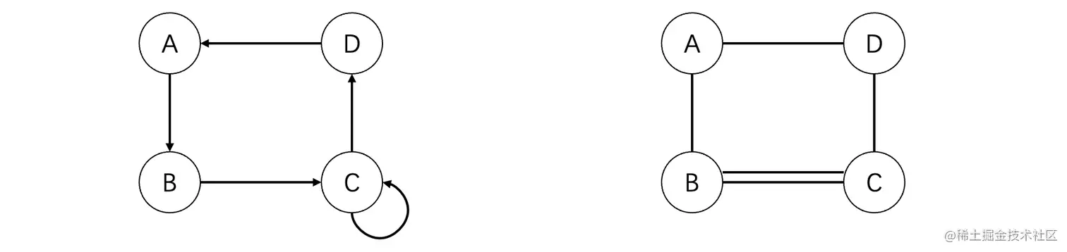 只要我们的图中不出现自回路边或是重边,那么我们就可以称这个图为简单图,比如上面两张图都是简单图。而下面的则是典型的非简单图了,其中图一出现了自回路,而图二出现了重边: