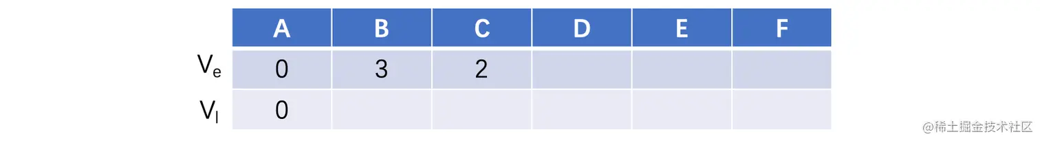 按照之前的拓扑排序的顺序进行,首先一开始是A,因为只有一个起点A肯定是可以直接开始的,所以说最早和最晚时间都是0(如果出现多个起点的话,最晚开始时间就不一定了),我们接着图的工作顺序,来计算任务B和C的最早和最晚时间: