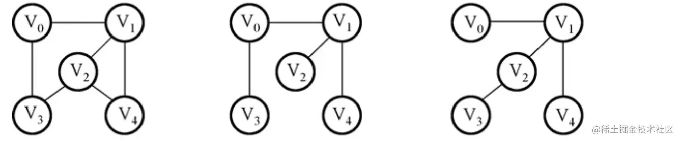对于图 G=(V,E) 和 G′=(V′,E′),若满足 V′ 是 V 的子集,并且 E′ 是 E 的子集,则称 G′ 是 G 的子图,比如下面的两个图: