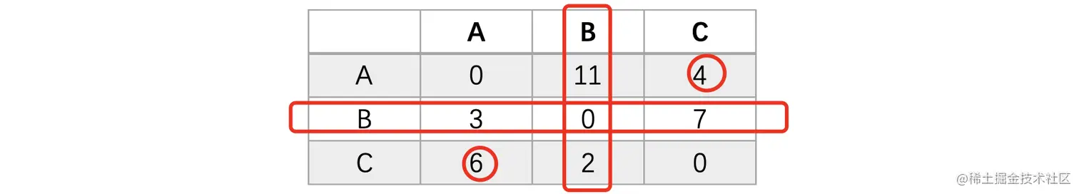 此时我们看到,除了对角线以外,就是B->C和C->B的这两个位置,我们按照上面的规则,进行计算: