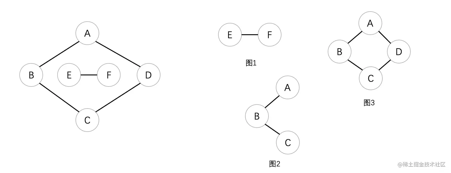 可以看到右侧图1、2、3都是左图的子图,但是它们并不都是原图的连通分量,首先我们来看图1,它也是一个连通图,并且包含极大顶点数和所有的边(也就是原图内部的这一块)所以说它是连通分量,我们接着来看图2,它虽然也是连通图,但是并没有包含极大顶点数,所以说并不是。最后来看图3,它也是连通图,并且包含了极大顶点数和边,所以说是连通分量。