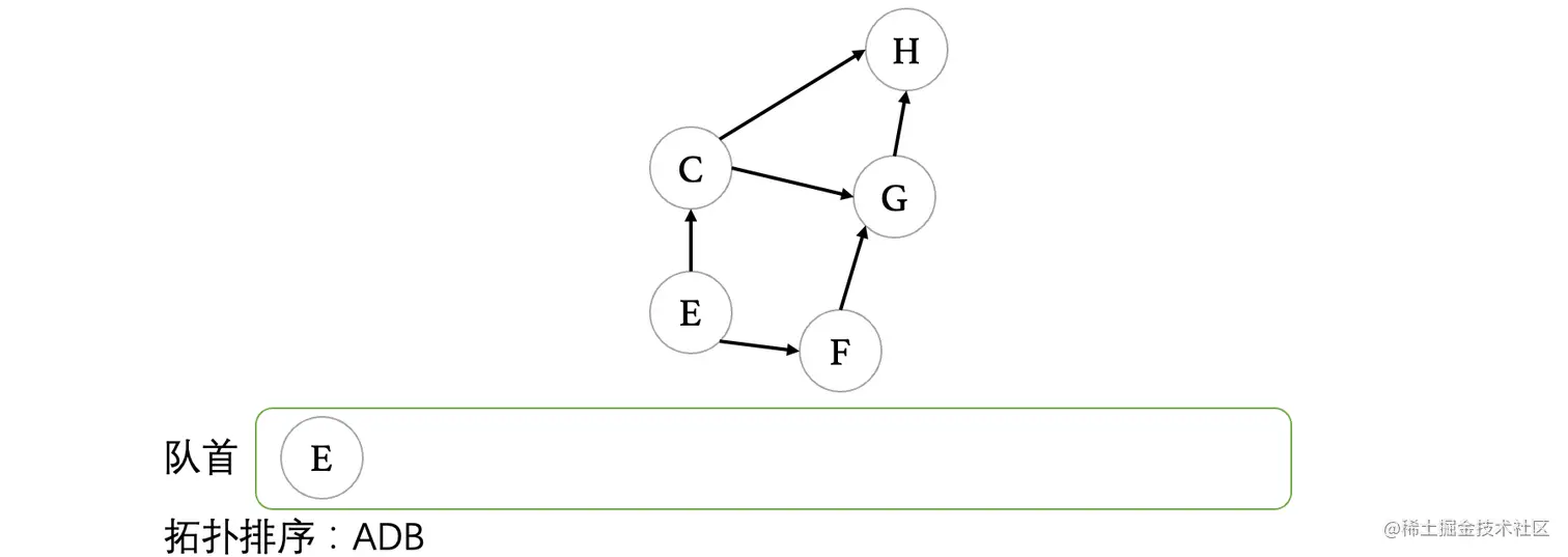 接着,我们继续让D出队,我们发现D出队之后,E变成了入度为0的顶点,所以说将E入队: