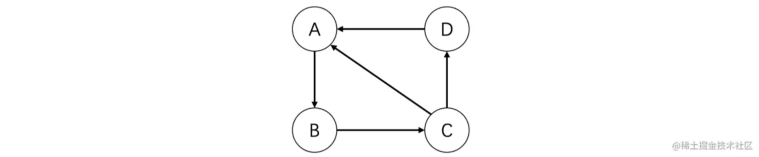 当然我们也可以将其表示为有向图,集合V={A,B,C,D},集合E={<A,B>,<B,C>,<C,D>,<D,A>,<C,A>},有向图的边使用尖括号<>表示。比如这个有向图,它就长这样: