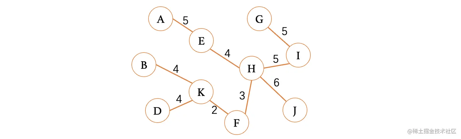 在一开始的时候,直接去掉所有的边,我们从这些边中一个一个选择出来(注意是任意一条边都可以选择,并不是只有选择的顶点旁边才能选择,这个过程中可能会出现多棵树,但是最后一定会连成一棵树的),最后形成一颗最小生成树,假设一开始什么都没选择,被选中的边我们一会用橙色标注: