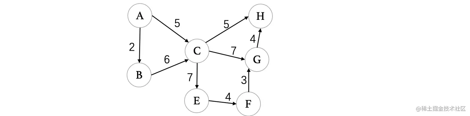 比如A代表某个任务(事件),B代表另一个任务,我们需要先花费2天时间完成A之后,才能开始B,活动包括时间用边来表示,我们将边作为活动的图称为AOE图,每个事件对应着多个活动(多条边)它就像一个大工程一样,从A开始,中间需要经过各种各样的步骤,最后到H完工作为结束。