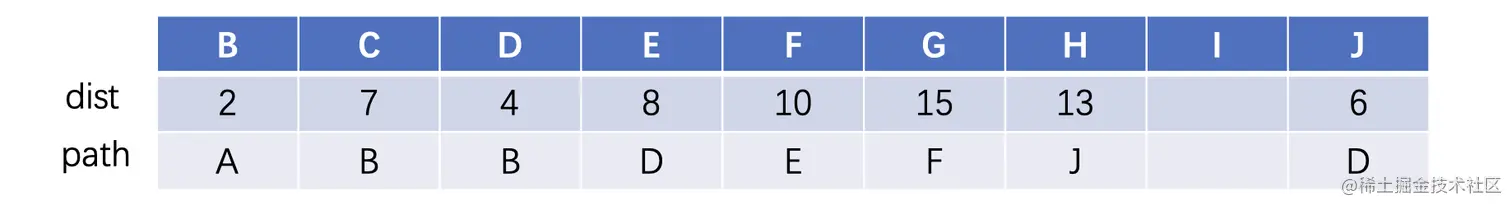 接着我们继续找到下一个离A最近的顶点D,D与顶点E和J相连,直接更新即可,比如E的最短路径就是相当于是A到D的最短路径加上D到E的路径,D到J也是同理: