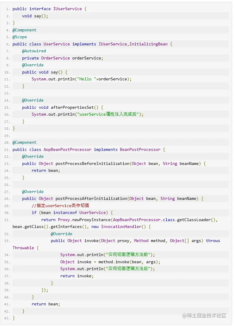 首先创建BeanPostProcessor接口,作为所有bean实例的对外扩展接口创建BeanPostProcessor接口实现类,模拟AOP功能,指定userService类进行切面。