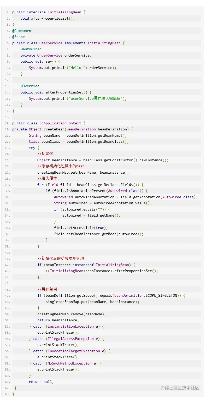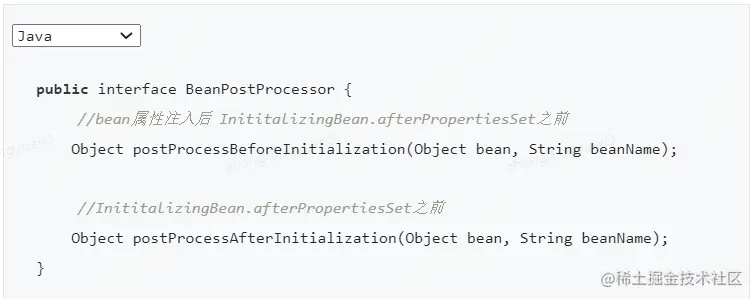 在createBean过程中,我们可以对外提供初始化扩展接口InitializingBean接口。只要实现该接口,我们就可以针对bean的初始化进行扩展功能实现。 ![]