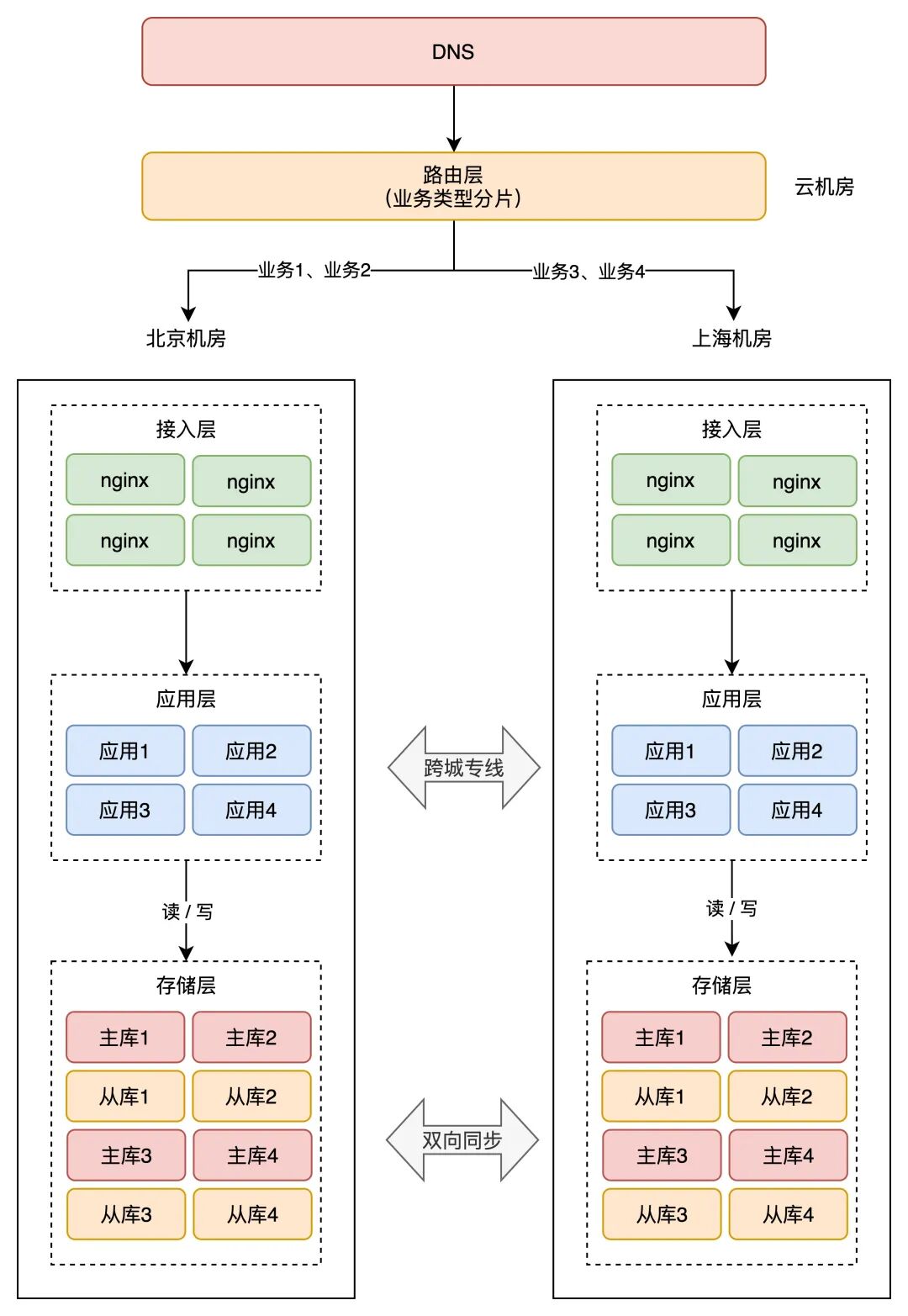 具体来讲就是,要在最上层就把用户「区分」开,部分用户请求固定打到北京机房,其它用户请求固定打到上海 机房,进入某个机房的用户请求,之后的所有业务操作,都在这一个机房内完成,从根源上避免「跨机房」。