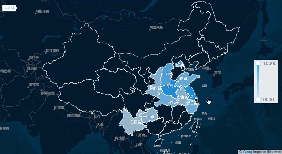 这种地图的数据查询方式是通过动态特效进行交互,在钻取时点击想要的地理位置的区域,就可以钻取国家>省>市>区等不同地理层级的数据。