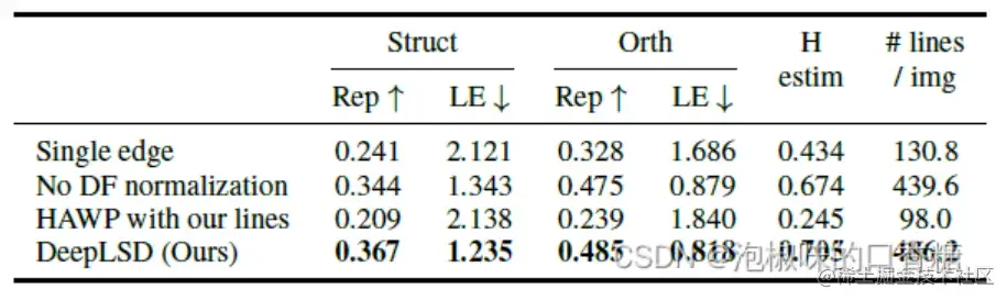结果如表2所示,DeepLSD总体上获得了最好的召回和精度。TP-LSD虽然在召回上排名第一,但是能够恢复的直线很少,其平均精度比DeepLSD小71 %。值得注意的是,DeepLSD比LSD能够重建更多的直线,且精度更高。