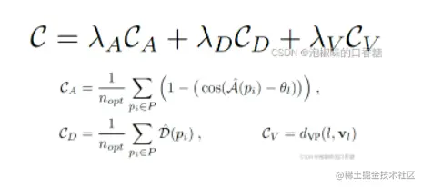 优化的核心思路是,在3D中平行的线将共享消失点。因此DeepLSD将其作为软约束融入到优化中,有效地降低了自由度。首先利用多模型拟合算法Progressive-X计算一组与预测线段相关的消失点(VPs)。然后对每条线段独立进行优化,损失函数是三种不同成本的加权无约束最小二乘最小化: