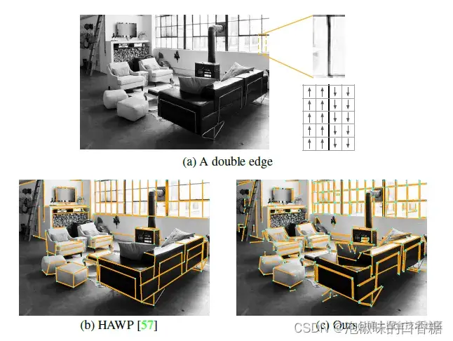 图4 区分双边缘。(a) 亮-暗-亮边缘和定向角度场的示例。(b) HAWP将其视为一条直线。(c) 为了准确,DeepLSD将其检测为两条线。