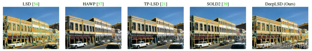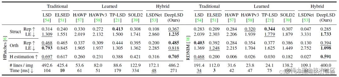 从结果来看,以TPLSD为首的学习方法具有较好的可重复性,但存在较低的定位误差和不准确的单应矩阵估计。手工方法和DeepLSD由于不直接对端点进行回归,而是利用非常低的细节逐步增长线段,因此精度更高。当变化最具挑战性时,DeepLSD比LSD表现出最好的改善,即在昼夜变化强烈的RDNIM上。可以显著提高定位误差和单应性估计分数。LSDNet由于通过将图像缩放到固定的低分辨率而失去了准确性。总体而言,DeepLSD在手工方法和学习方法之间提供了最佳的权衡,并且在单应性估计的下游任务中始终排名第一。
