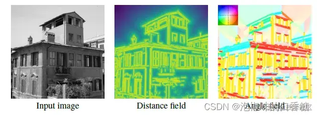 而DeepLSD这项工作的巧妙之处在于,作者提出将网络限制在一个较小的感受野,并使用传统的启发式方法来确定端点。DeepLSD采用和HAWP类似的吸引场,但没有额外的两个指向端点的角度,只保留线距离场(DF)和线角度场(AF)。其中线距离场DF给出当前像素到直线上最近点的距离,线角度场AF返回最近直线的方向:
