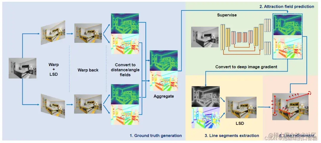 为了学习线吸引场,需要ground truth。AFM和HAWP都是使用线框数据集的真值来监督。但DeepLSD的作者探索了一种新的方法,即通过引导先前的线检测器来获取真值。具体来说,就是通过单应性自适应生成真值吸引场。给定单幅输入图像I,将其与N个随机单应矩阵Hi进行wrap,在所有wrap后的图像Ii中使用LSD检测直线段,然后将其wrap回到I来得到线集合Li。